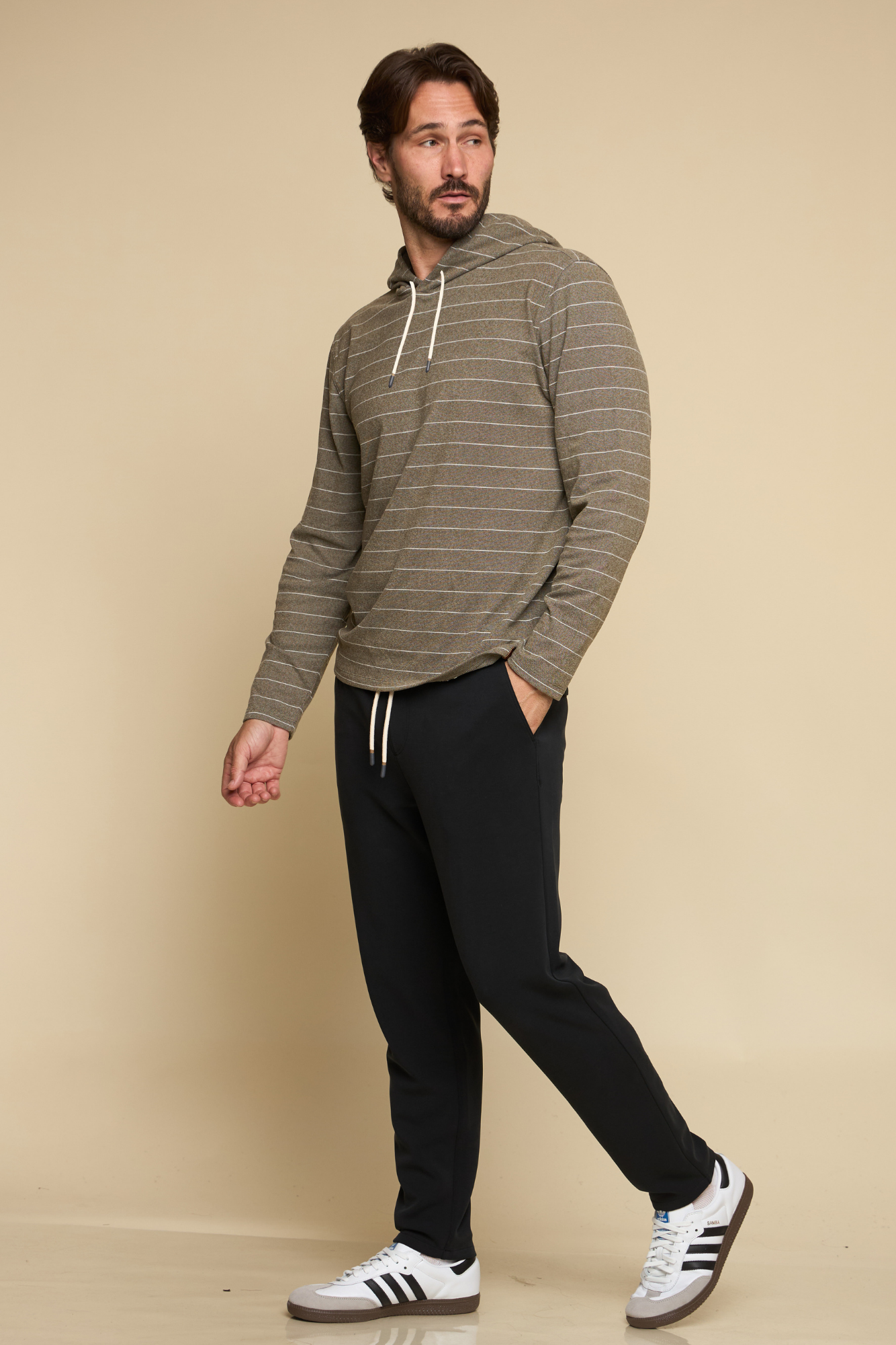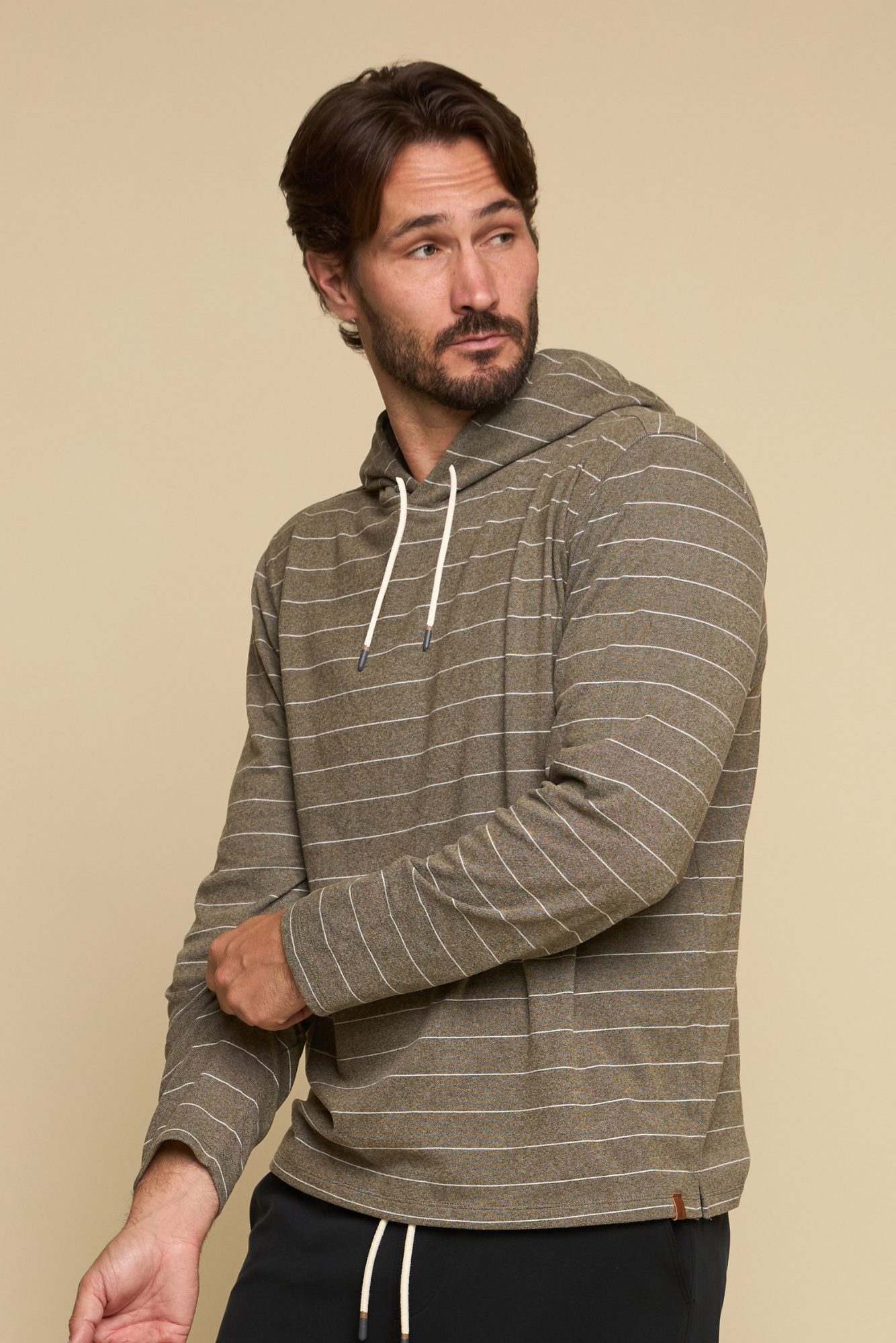 The Balboa - Men’s Hoodie in fatigue delivers effortless comfort with a modern edge. Crafted in brushed knit fabric with horizontal stripe detail, it features an open bottom with side split and drawcord hood, making it an easy layering piece for year-round wear.