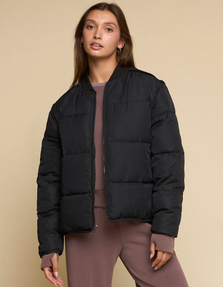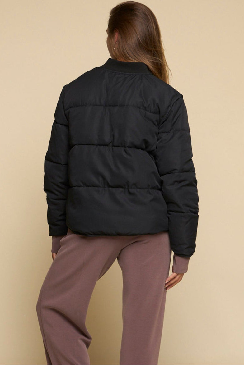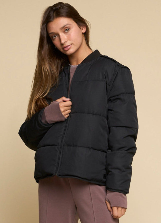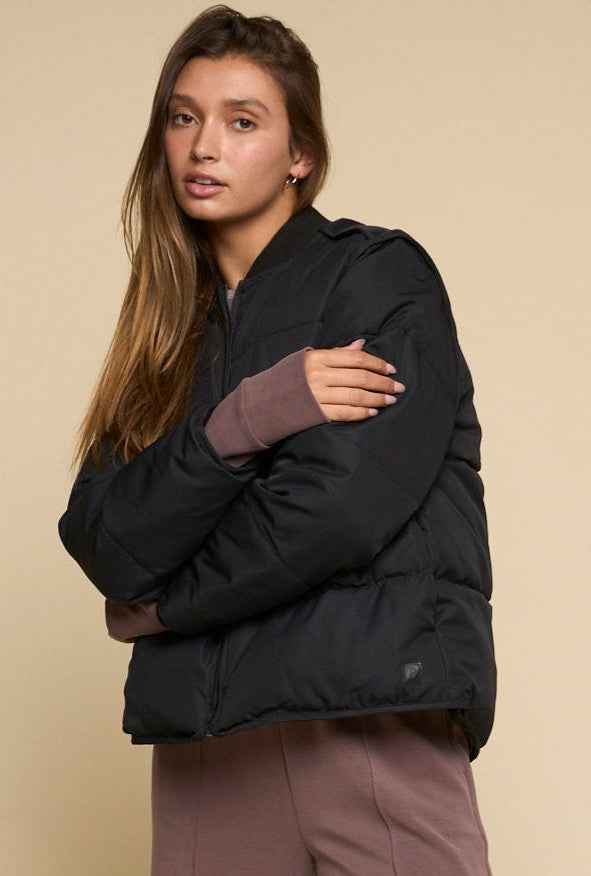 The Summit - Women’s Jacket in jet black blends military-inspired design with modern puffer functionality. Featuring horizontal quilting, ribbed bomber collar, on-seam side entry pockets, and an interior pocket, it delivers lightweight warmth with versatile style for everyday wear.