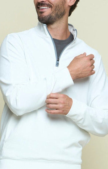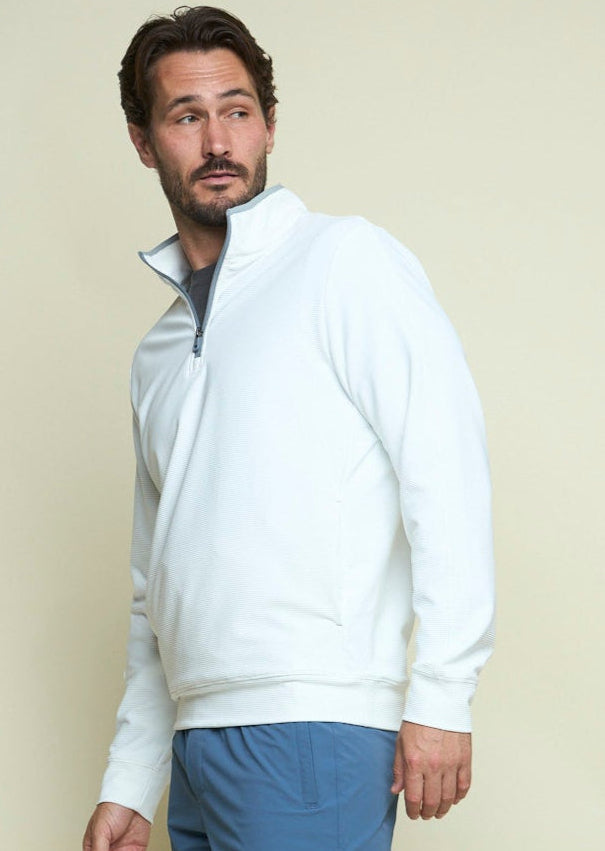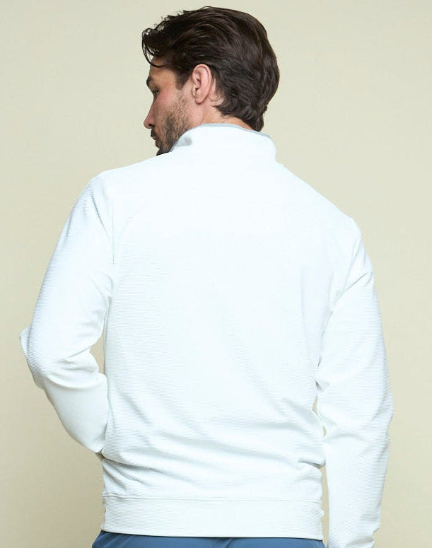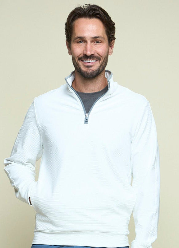 Polished and versatile, the Legend - Men’s Quarter Zip in frostbite is a modern essential designed for everyday performance. Its sleek ribbed fabric, classic silhouette, and high-stretch comfort make it the perfect layer for golf, travel, or weekends by the coast.