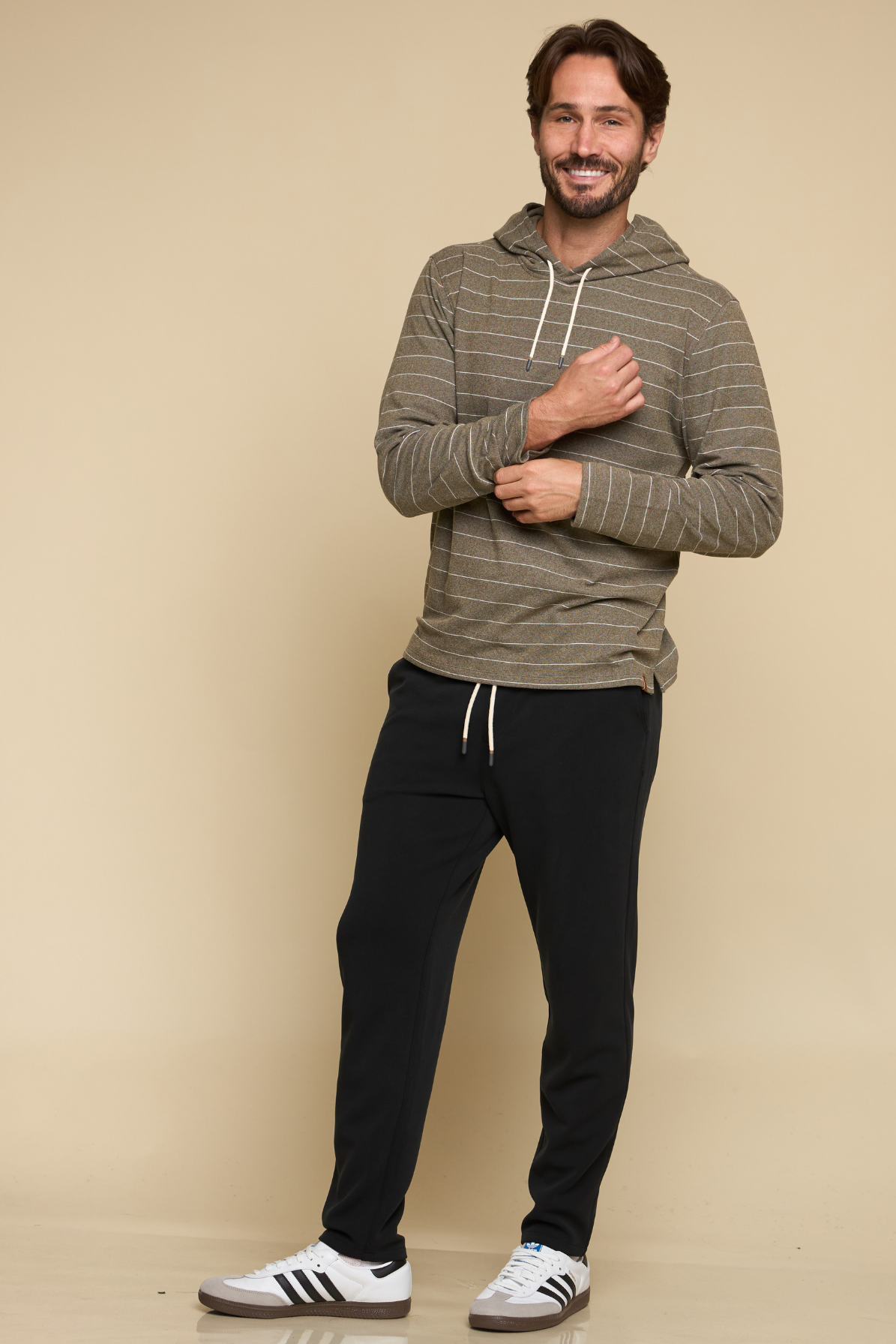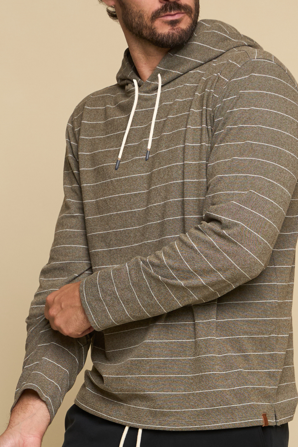 The Balboa - Men’s Hoodie in fatigue delivers effortless comfort with a modern edge. Crafted in brushed knit fabric with horizontal stripe detail, it features an open bottom with side split and drawcord hood, making it an easy layering piece for year-round wear.