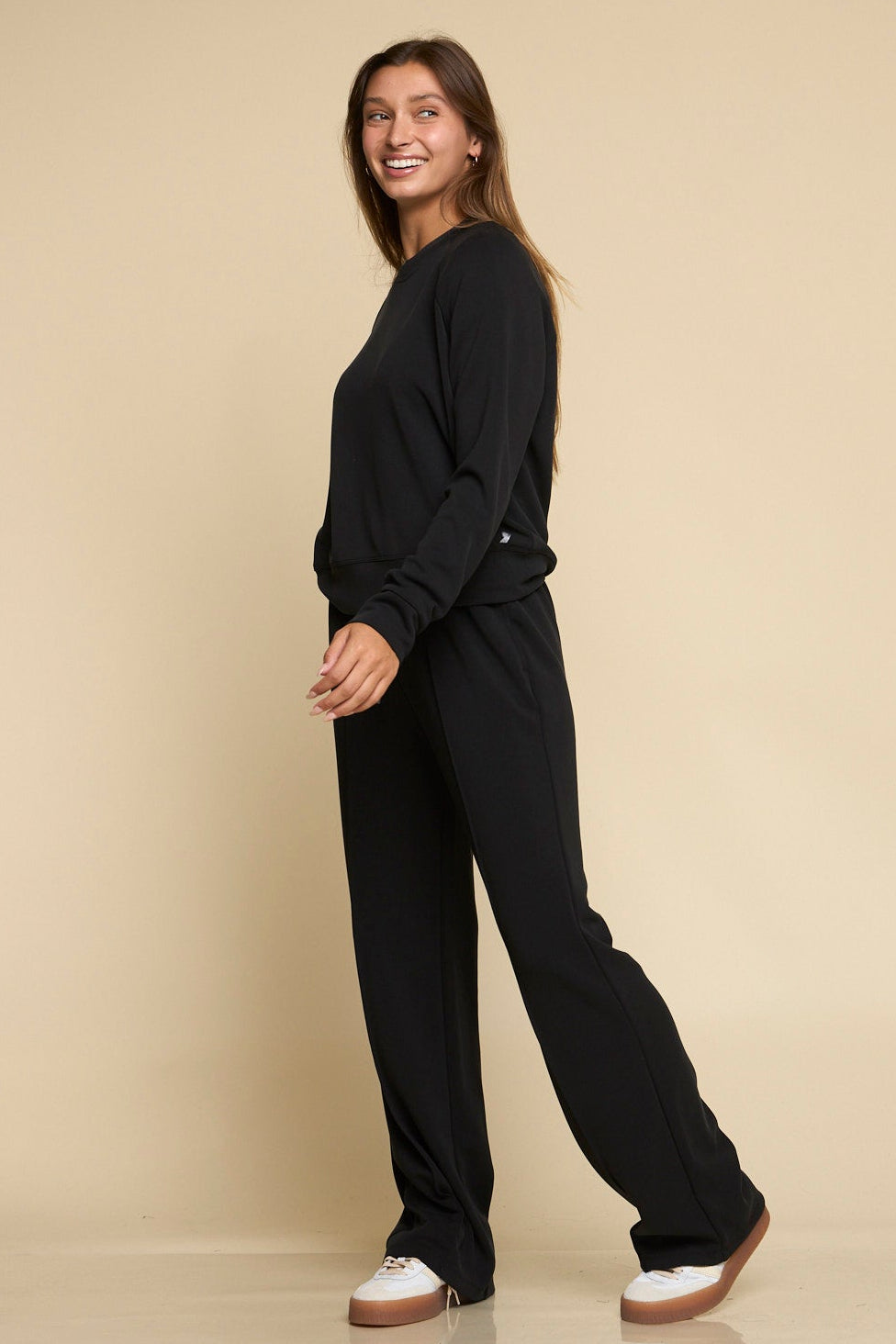 The Later On - Women’s Sweatshirt in jet black is an effortlessly polished essential with unmatched softness and comfort. Designed with raglan sleeves, thumb holes, and a banded bottom, it combines a modern silhouette with cozy versatility. Natural variations in the fabric give each piece a unique, elevated look.