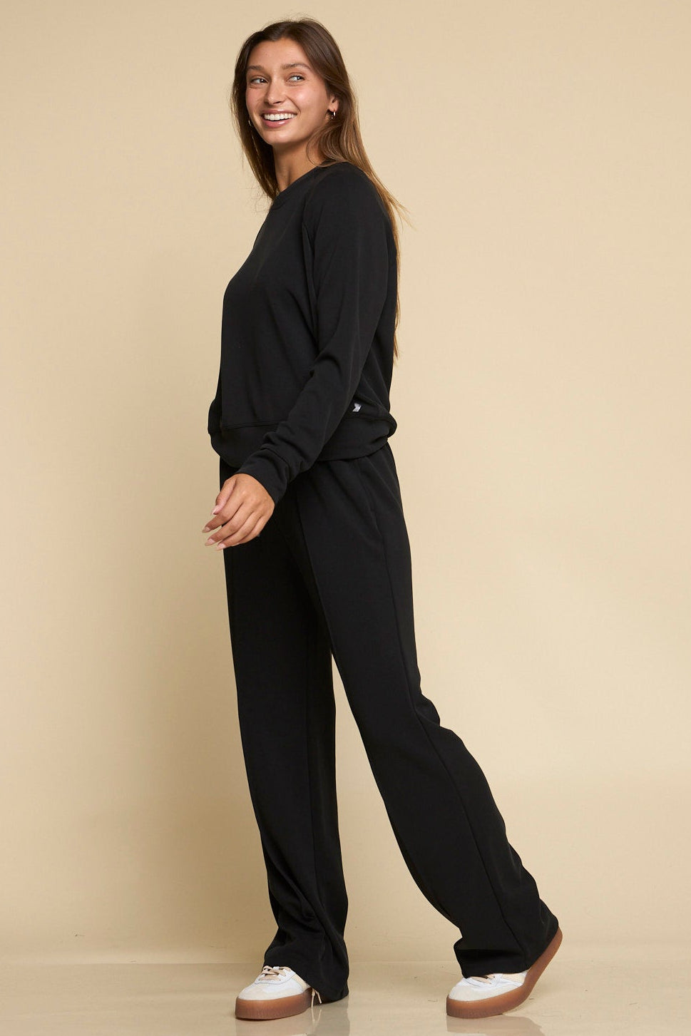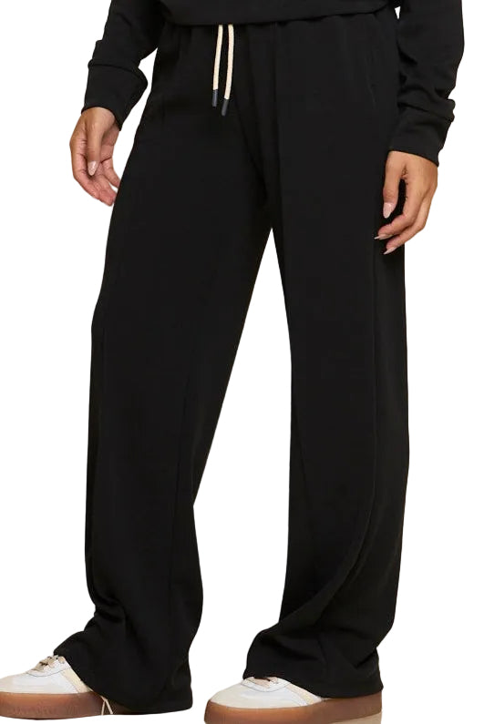 The Later On – Women’s Wide Leg Pant in jet black delivers effortless polish with fluid drape and soft stretch fabric. Designed with a drawcord waist, pintuck details, and on-seam pockets, these versatile pants pair comfort with elevated style — ideal for lounging, travel, or casual outings.