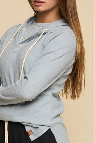 The PCH - Women’s Henley Hoodie in limestone brings together casual comfort and functional design in a soft waffle fabric. Featuring a high-low hem with side slits, thumbholes, and a drawcord hood, it’s built for versatility whether layered or worn on its own.