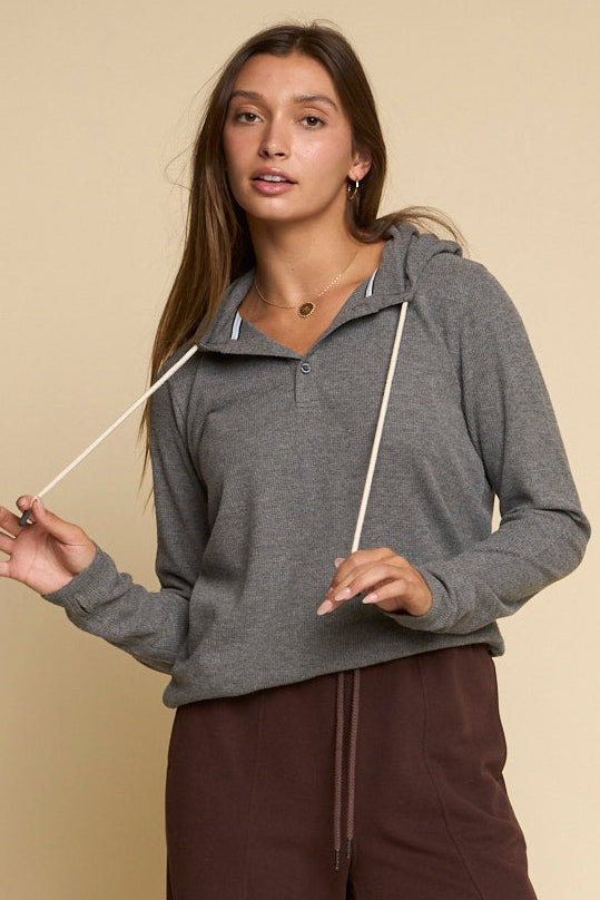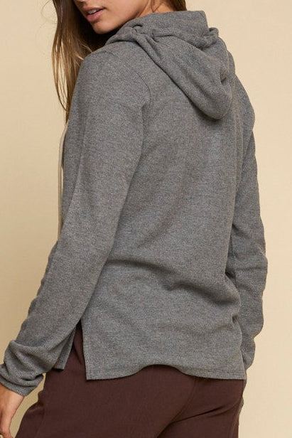The PCH - Women’s Henley Hoodie in smoke brings together casual comfort and functional design in a soft waffle fabric. Featuring a high-low hem with side slits, thumbholes, and a drawcord hood, it’s built for versatility whether layered or worn on its own.